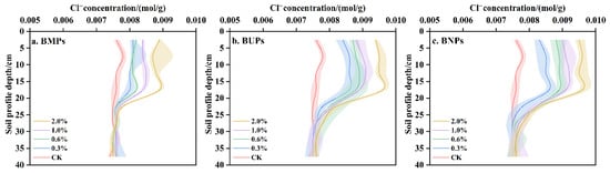 Figure 11 shows the measured values of Cl− concentration at different profile depths in each treatment. As can be seen from the figure, the Cl− concentration at the upper and lower positions of the soil column (0–20 and 20–40 (cm)) in the biochar treatments were filled with two types of soil (i.e., the upper layer was biochar-amended soil, and the lower layer was unamended soil), resulting in significant differences in the Cl− concentration at the upper and lower positions of the soil column. At 0–20 cm, the Cl− concentration was generally higher than that at the lower level due to the addition of biochar, and it increased gradually with increasing applied amount. At 20–40 cm, there was no significant difference in Cl− concentration between treatments due to the same soil matrix. The difference in Cl− concentration indicates that the biochar-amended soils have certain adsorption properties for Cl−. Although Cl− belongs to the non-reactive adsorption of inert ions and does not have strong adsorption with the soil matrix, biochar has a large specific surface area and magnetic and other adsorption bases, so it still has a certain adsorption effect for Cl−. Moreover, the adsorption amount of Cl− in the upper layer of biochar-amended soils with different structures differed, and the adsorption capacity of the amended soil for Cl− increased with the decrease in the particle size of biochar.