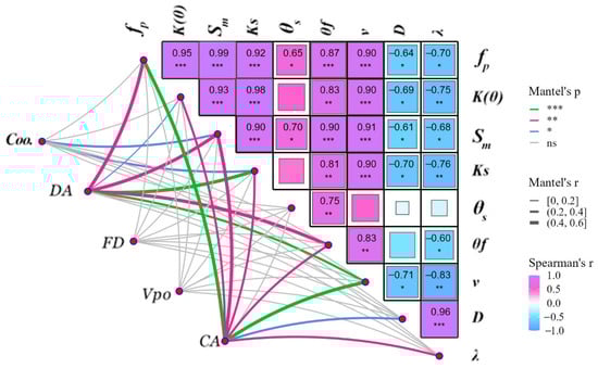 Mantel test analysis of the pore characterization parameters and contact angle with the biochar–soil matrix’s hydraulic, infiltration, and solute penetration parameters. Note: Coo.: connectivity; DA: anisotropy; FD: fractal dimension; Vpo: porosity; CA: contact angle; fp: steady percolation rate; K(θ): approximate saturated hydraulic conductivity; Sm: interfacial suction; Ks: saturated hydraulic conductivity of the soil; θs: saturated water content of the soil; θf: water holding capacity of the field; v: average pore flow rate; D: hydrodynamic dispersion coefficient; λ: dispersion degree; ‘*’, ‘**’, and ‘***’ denote significance at p < 0.05, p < 0.01, and p < 0.001 level, respectively; ns: not significant.