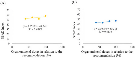 SPAD index 48 days after planting (DAP) in potato plants Ágata (A) and SPAD index 91 DAP in potato plants Atlantic (B) as a function of organomineral fertilizer dose.