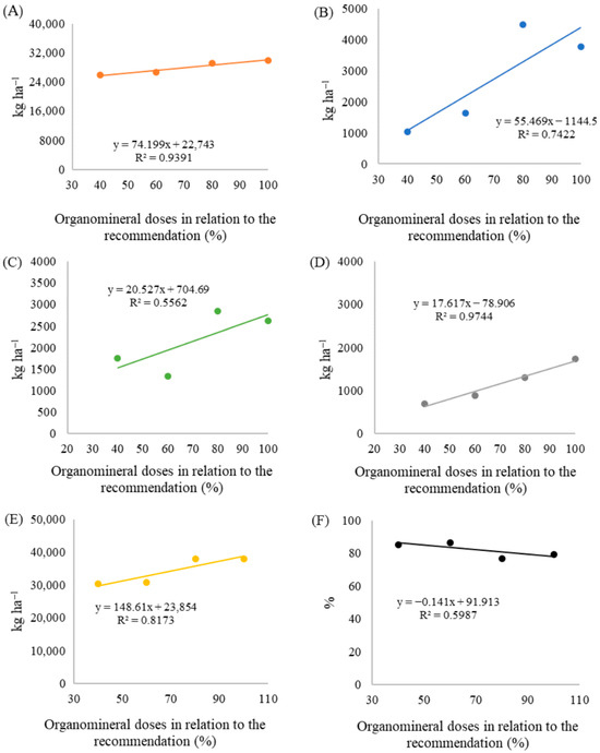 When the linear regression models for the potato classifications of the cultivar Ágata, are analyzed, increases in the categories “First”, “Diverse”, “Jumbo”, and “Discard” are observed when organomineral fertilization is used; these values are 74.20, 55.47, 20.53, and 17.62 kg ha−1, respectively (Figure 3A–D) for each 1% of organomineral fertilizer applied. Therefore, the total productivity increased by 148.61 kg ha−1 of tubers for every 1% increase in the applied dose of organomineral fertilizer (Figure 3E).