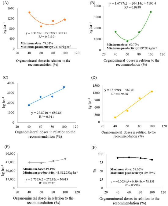 Classification of Atlantic potato tubers: First—33 to 42 mm (A); Diverse—up to 28 mm (B); Jumbo—greater than 70 mm (C); Discard—noncommercial tubers due to damage (D); total productivity (E); Special percentage—42 to 70 mm (F). “Minimum dose” or “Maximum dose” of organomineral refer to the inflection point of the quadratic curve on the graph.