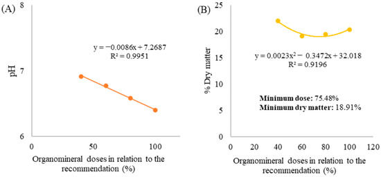 With respect to the pH, fertilization with 100% organomineral, together with standard fertilization, resulted in the lowest acidity for the cultivar Ágata. A linear decrease in pH was observed as the tested dose of the organomineral for the cultivar Ágata increased (Figure 5). For the Atlantic cultivar, lower acidity values were found with the dose of 80% organomineral.