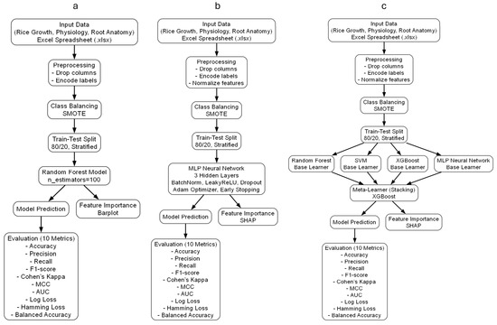 Block diagrams of machine-learning workflows for drought tolerance classification in rice using root anatomical and physiological traits. (a) Random forest, (b) multi-layer perceptron (MLP), (c) stacking ensemble. Each pipeline includes preprocessing, class balancing (SMOTE), model development, feature importance analysis, and evaluation.