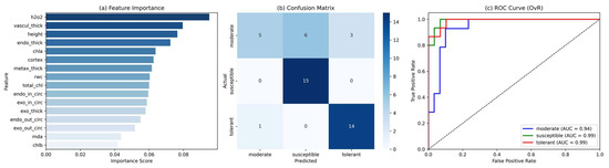 A random forest (RF) classification model was developed to predict drought response categories, namely tolerant, moderate, and susceptible, among diverse rice cultivars, based on a comprehensive set of physiological and root anatomical traits. After preprocessing and class rebalancing using the synthetic minority over-sampling technique (SMOTE), the optimized model achieved an overall classification accuracy of 77%, as evaluated on an independent test set. The model’s internal feature ranking, visualized in Figure 2a, identified hydrogen peroxide (H2O2) as the most influential trait, followed by vascular cylinder thickness, plant height, endodermis thickness, and cortex size. These traits collectively reflect a combination of oxidative stress signaling and root morphological adaptation, aligning with known mechanisms of drought tolerance. In contrast, features such as chlorophyll b, malondialdehyde (MDA), and external endodermal circumference contributed minimally to prediction and were subsequently excluded during model refinement. The confusion matrix (Figure 2b) revealed that the model achieved perfect classification of susceptible cultivars, high performance in the tolerant group, and minor misclassification in the moderate class, likely due to phenotypic overlap. Complementary to this, the multiclass ROC curves (Figure 2c) demonstrated excellent class separability, with AUC values of 0.99 for both the tolerant and susceptible groups and 0.94 for the moderate group. These results confirm the model’s high sensitivity and specificity, particularly in identifying extreme phenotypes under drought stress.