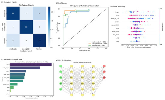 Integrated visualization of model performance and feature contribution in drought classification. (a) Confusion matrix: performance evaluation of the optimized ensemble classifier (random forest + SVM) on the test dataset. Class-wise prediction accuracy is presented for three drought tolerance categories: moderate, susceptible, and tolerant. (b) ROC curve: receiver operating characteristic (ROC) curves for the multi-class classification task, with class-specific area under the curve (AUC) values reported. The ensemble model demonstrates high discriminative power, particularly for the susceptible class (AUC = 0.98). (c) SHAP Summary: SHAP (Shapley additive explanations) values for classifying susceptible genotypes reveal the directional impact of each feature on model output. Key traits such as plant height, hydrogen peroxide content (H2O2), and endodermis inner circumference show the strongest influence. (d) Permutation importance: Global feature importance derived from permutation analysis of the random forest model. Physiological (H2O2) and anatomical (endodermis, cortex) variables emerge as critical determinants of drought tolerance prediction. (e) MLP architecture: Schematic of the multi-layer perceptron (MLP) model used in the study. The network consists of 10 input nodes, three hidden layers (with 512, 256, and 128 neurons), and a softmax-activated output layer. Nodes are color-coded by layer type: green (input), yellow (hidden), and red (output).