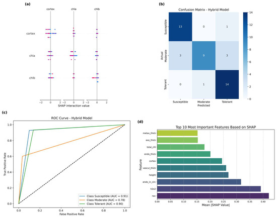 Performance evaluation and model interpretation of the SHAP-optimized stacking ensemble model for drought tolerance classification. (a) SHAP interaction plot illustrating second-order relationships among three key physiological traits: cortex, chla, and chlb. The x-axis represents SHAP interaction values, highlighting synergistic or antagonistic feature effects on classification outcomes. (b) Confusion matrix of the final stacking ensemble model, showing class-wise prediction accuracy across three drought response categories: susceptible, moderate, and tolerant. High classification accuracy was observed in the tolerant group (recall = 0.93). (c) Receiver operating characteristic (ROC) curves for multiclass classification performance. The model achieved area under the curve (AUC) values of 0.91, 0.78, and 0.90 for susceptible, moderate, and tolerant classes, respectively. (d) Ranked bar plot of the top 10 most important features based on mean absolute SHAP values. Physiological parameters, including rwc (relative water content) and H2O2 (hydrogen peroxide), were among the most influential, alongside key root anatomical traits such as endo_in_circ, vascul_thick, and cortex, suggesting the combined importance of water retention, oxidative stress response, and structural resilience under drought conditions.