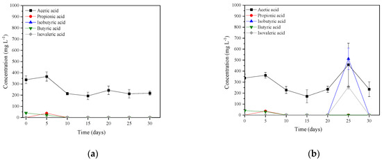 Figure 3c,d reveals a distinct metabolic profile for S. hirsutum, which produced up to four VFAs, including isobutyric, isovaleric, and acetic acids. At day 30, isobutyric acid dominated the profile with concentrations between 748 ± 154 and 776 ± 168 mg L−1, followed by acetic acid (457 ± 78–478 ± 85 mg L−1). These values are approximately twice as high as those achieved by A. discolor, which primarily generated acetic acid as the only detectable VFA (Figure 3a,b).