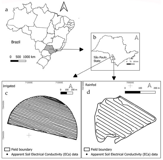 Location of the study area: (a) country, (b) state, (c) irrigated fields, and (d) rainfed fields. The distribution of ECa sampling rows is also shown.
