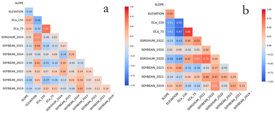 In the rainfed system, distinct patterns emerged. Slope showed a moderate negative correlation with ECa (r = −0.61), indicating that flatter areas retain more moisture. This relationship was mirrored in yield patterns, with sorghum performing better in areas with lower slopes (r = −0.40 and −0.21), while soybean exhibited variable responses depending on the crop year. Elevation demonstrated a strong negative correlation with ECa (ranging from −0.82 to −0.87), suggesting that lower-lying areas tend to accumulate more moisture and salts. Regarding yield, sorghum benefited from higher ECa values (r = 0.40 and 0.62), whereas soybean showed negative correlations in some years (ranging from −0.31 to −0.34), likely due to its sensitivity to excessive soil moisture.