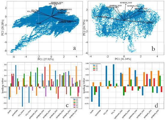 PCA biplot ((a)—irrigated, (b)—rainfed) and PC loadings ((c)—irrigated, (d)—rainfed).