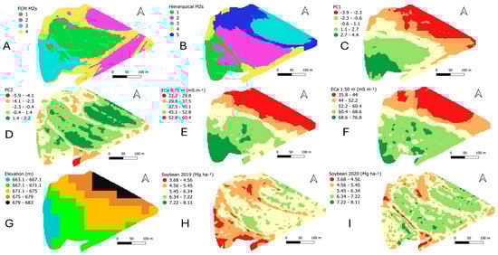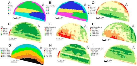 MZs delineated by two methods in the irrigated area (A,B) First two principal components (PC1 and PC2) (C,D). Most important attributes contributing to the first two PCs (E–I).