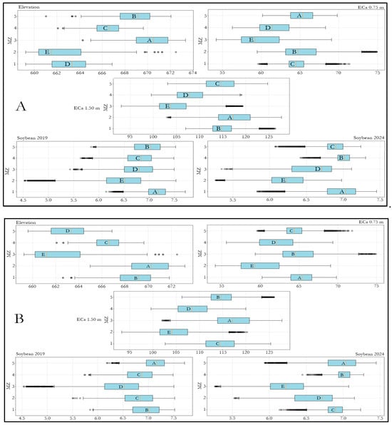 Boxplot of variables with the highest importance in the PCA analysis for the irrigated area, where (A) shows data distribution after FCM and (B) with hierarchical clustering. Shared letters indicate statistically similar medians between MZs (Kruskal–Wallis test with Dunn’s post-hoc, α = 0.05).
