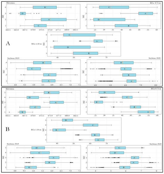 Boxplot of variables with the highest importance in the PCA analysis for the rainfed area where (A) shows data distribution after FCM and (B) with hierarchical clustering. Shared letters indicate statistically similar medians between MZs (Kruskal–Wallis test with Dunn’s post-hoc, α = 0.05).