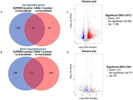 Venn diagram and volcano plots of gene expression in resistant (SUPER5) and susceptible (CN84-1) mungbean genotypes. (A) Representing the Venn diagram showing upregulated genes in the resistant line SUPER5 and the susceptible variety CN84-1. (B) Representing the Venn diagram showing downregulated genes in the resistant line SUPER5 and the susceptible variety CN84-1. (C) Representing the volcano plot illustrating the interaction between SUPER5 (control) and SUPER5 (inoculated). (D) Representing the volcano plot illustrating the interaction between CN84-1 (control) and CN84-1 (inoculated). Red and blue dots represent significantly upregulated and downregulated genes, respectively. The horizontal axis represents the log2 fold change in gene expression, and the vertical axis represents the statistical significance of gene expression differences in log10 (q-value (FDR, p-adj)).