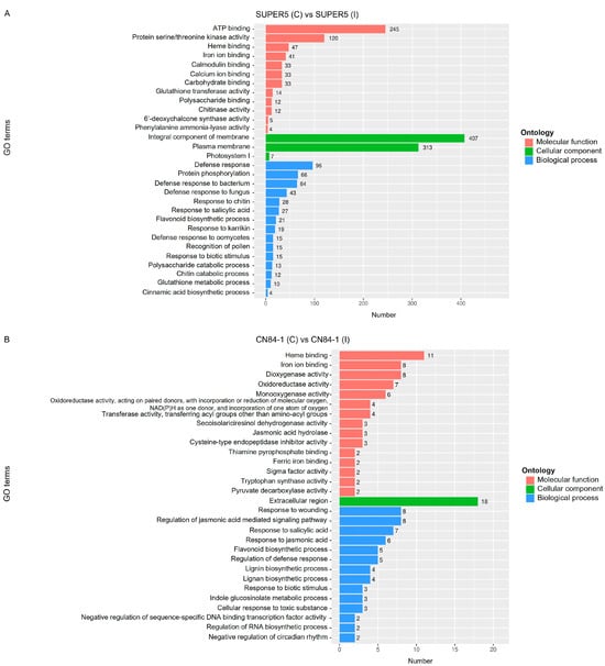 GO analysis of DEGs in the resistant line SUPER5 (SUPER5 (control) vs. SUPER5 (inoculated)) (A) and the susceptible variety CN84-1 (CN84-1 (control) vs. CN84-1 (inoculated)) (B).