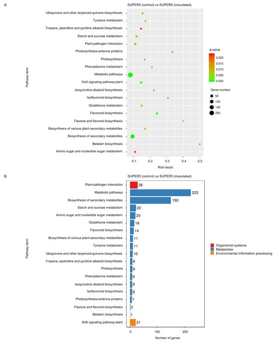 KEGG pathways significantly enriched DEGs in an interaction between control and inoculated conditions in SUPER5 (A). The size of each circle represents the number of enriched DEGs, while the color indicates the q-value range. The number of DEGs enriched in an interaction between control and inoculated conditions in SUPER5 (B). Red indicates the organismal systems, blue indicates the metabolism, and orange indicates the environmental information processing. The rich factor represents the ratio of DEGs in a pathway relative to the total genes in that pathway. The q-value is the p-value after multiple hypothesis testing and ranges between 0 and 1; the closer to zero, the more significant the enrichment.