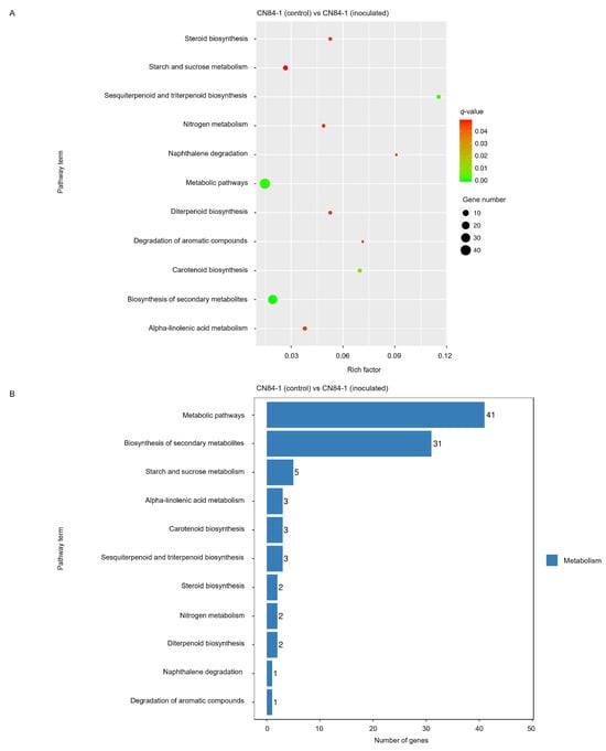KEGG pathways significantly enriched DEGs in an interaction between control and inoculated conditions in CN84-1 (A). The size of each circle represents the number of enriched DEGs, while the color indicates the q-value range. The number of DEGs enriched in an interaction between control and inoculated conditions in CN84-1 (B). Blue indicates the metabolism. The rich factor represents the ratio of DEGs in a pathway relative to the total genes in that pathway. The q-value is the p-value after multiple hypothesis testing and ranges between 0 and 1; the closer to zero, the more significant the enrichment.