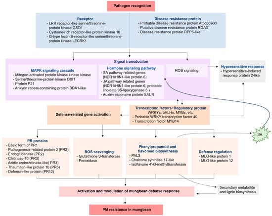 The results of this study identified several key pathways integral to disease resistance mechanisms in mungbean. These pathways include plant–pathogen interactions, characterized by the activation of RLKs, R proteins, and PR proteins, which play critical roles in recognizing and responding to pathogen attacks. Additionally, phenylpropanoid metabolism and flavonoid biosynthesis pathways were implicated, contributing to the enhanced production of antimicrobial compounds and lignin that bolster plant defense. Hormone signaling pathways, involving the coordinated regulation of SA and JA, were also identified as essential for orchestrating defense responses. Furthermore, ROS signaling and scavenging pathways were highlighted for their role in managing oxidative stress during pathogen defense. Together, these pathways provide a comprehensive framework for understanding the molecular mechanisms underlying PM resistance in mungbean.