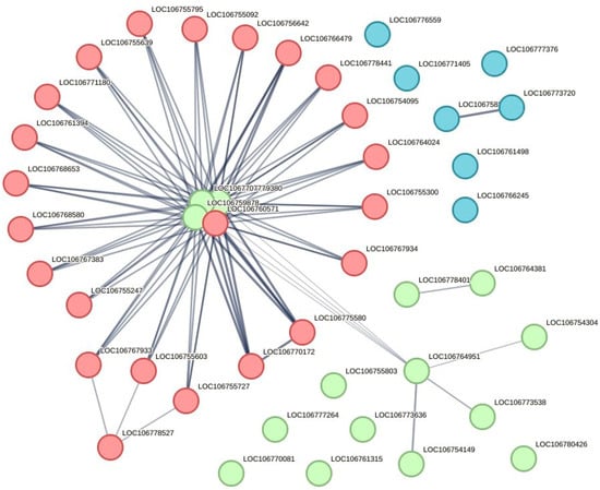 Co-expression network analysis was conducted using the STRING (version 12) to elucidate the interactions among candidate genes. The resulting network comprised 45 nodes and 97 edges and was divided into three distinct clusters. Cluster 1 contained 23 genes predominantly associated with chitin catabolism and amino sugar metabolism, represented by the red color. Cluster 2 included seven genes associated with the thaumatin family, AGC-kinase, C-terminal, and LEAF RUST 10 DISEASE-RESISTANCE LOCUS RECEPTOR-LIKE PROTEIN KINASE, represented by the blue color. The remaining 15 genes were grouped into Cluster 3, represented by the green color (Figure 7; Tables S4 and S5).