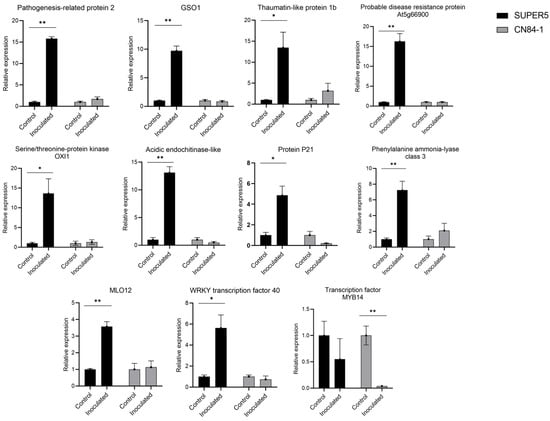 Among the 15 candidate genes, 11 were amplifiable; the expression patterns of these were validated using qRT-PCR. It was found that the genes encoding PR2, LRR receptor-like serine/threonine-protein kinase GSO1, the probable disease resistance protein At5g66900, acidic endochitinase-like, PAL3, and MLO-like protein 12 exhibited a highly significant upregulation in the resistant line SUPER5 (p ≤ 0.01), with a 15.80-, 9.73-, 16.28-, 13.10-, 7.24-, and 3.58-fold increase in expression, respectively, but showed no significant change in the susceptible variety CN84-1. Additionally, genes encoding proteins associated with disease resistance, including thaumatin-like protein 1b, serine/threonine-protein kinase OXI1, protein P21, and probable WRKY transcription factor 40, were significantly upregulated only in SUPER5 (p ≤ 0.05), with fold changes of 13.48, 13.64, 4.86, and 5.64, respectively (Figure 8), while the genes encoding transcription factor MYB14 were highly significantly downregulated only in CN84-1 by 22.33-fold (p ≤ 0.01), but not in SUPER5. Correlation of these 11 DEGs as identified from RNA-seq with those from qRT-PCR revealed a significant correlation with a coefficient of 0.64 (p < 0.05). These results validated RNA-seq findings and suggest a robust and coordinated defense response against PM infection. A functional characterization of each protein encoded by these genes is provided below.