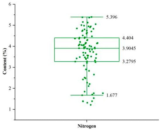 Box-and-whisker plot of sample N content. The boxes represent the interquartile range, the lines inside the boxes represent the medians, and the whiskers denote the lowest and highest values within 1.5 times the interquartile range. Each point represents the N content of an individual cucumber leaf.