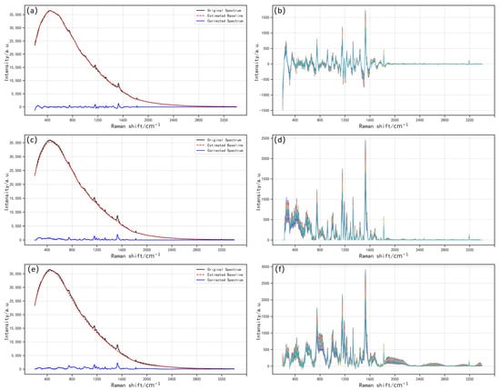 Comparison of preprocessing and correction effects of three baseline correction methods. (a,b) BW; (c,d) IIMA; (e,f) IPF.