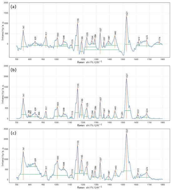 Figure 3 illustrates the preprocessing of raw spectra using the three baseline correction methods—BW, IIMA, and IPF—along with their corresponding corrected spectra. As shown in Figure 3a,c,e, the baselines fitted via these methods exhibited slight variations, leading to noticeable differences in the corrected spectral data. However, when combined with Figure 3b,d,f, it is evident that the Raman spectra of the three corrected datasets within the 700–1800 cm−1 range consistently display a series of prominent feature peaks. In contrast, spectral regions outside this range were dominated by noise interference or weak signals, which failed to provide stable spectral information. To minimize the impact of invalid signals while preserving key spectral features, this study selected the 700–1800 cm−1 range for subsequent quantitative analysis. Each extracted spectrum contained 1101 data points.