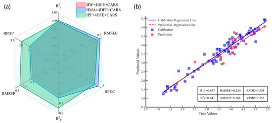 Radar and scatter plots for 4DFE + CARS + PLSR model performance evaluation. (a) Comparison of evaluation results for the calibration and prediction sets across the three combination schemes; (b) scatter plot of measured versus predicted values for the IPF + 4DFE + CARS + PLSR model.