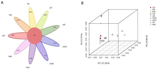 (A) Venn diagram and (B) spatial distribution. Principal component analysis illustrated the operational taxonomic units (OTUs) of big-bale Leymus chinensis before and after fermentation. FM represents fresh material; C, L, M, and LM denote the control group, Lacticaseibacillus rhamnosus group, molasses group, and Lacticaseibacillus rhamnosus + molasses group, respectively. The numbers after C, L, M, and LM denote fermentation times.