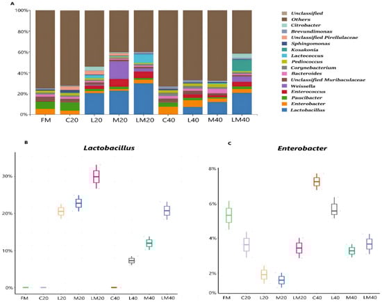 Figure 1B shows the distribution and differences in bacterial communities between the different sample groups in big-bale L. chinensis silage treated with L. rhamnosus and molasses. There is a clear separation of bacterial communities between the fresh samples and the big-bale L. chinensis silage samples. In our previous research, similar results were also obtained when molasses and L. rhamnosus were added to big-bale alfalfa silage []. In addition, compared with the M40 group, the bacterial community structures of the LM40 and the L40 groups had a high degree of similarity. This may be because both groups were inoculated with L. rhamnosus. These results indicate that the inoculation of L. rhamnosus can significantly change the bacterial community structure of big-bale L. chinensis silage.