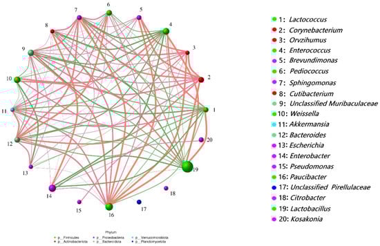 The co-occurrence network of a bacterial community is shown in Figure 3. In silage, the co-occurrence network is one of the most important characteristics of its bacterial ecosystem []. After 20 and 40 days of fermentation, harmful microorganisms (such as Enterobacter and Paucibacter) in the C group likely decreased the fermentation quality. The abundance of Lactobacillus correlated positively (p < 0.01) with Lactococcus (R = 0.90), Enterococcus (R = 0.88), and Weissella (R = 0.73), while it negatively correlated (p < 0.01) with Enterobacter (R = −0.66) and Paucibacter (R = −0.49). Conversely, Enterobacter and Paucibacter showed a positive correlation during fermentation (p < 0.01; R = 0.55). Overall, the co-occurrence network shows LAB in synergistic or competitive relationships with important microorganisms in big-bale L. chinensis silage.