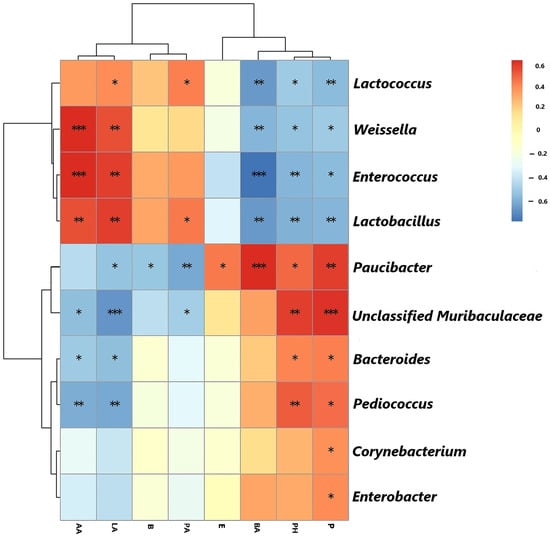 Correlation analysis between the bacterial community and pH and fermentation products. LA, lactic acid; BA, butyric acid; AA, acetic acid; PA, propanoic acid; E, ethanol; P, 1,2-propanediol; and B, 1-propanol. *, 0.01 < p < 0.05; **, 0.001 < p < 0.01; and ***, p < 0.001.