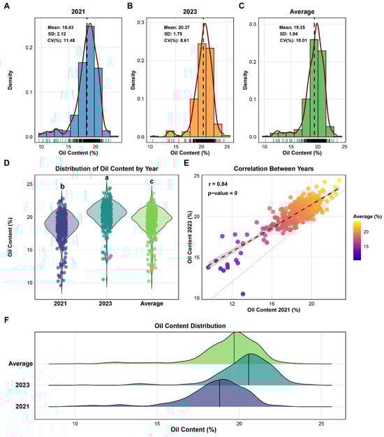 Distribution and comparison of seed oil content (%) across two growing seasons (2021 and 2023) along with their average in a natural soybean population. (A–C) Histograms overlaid with density curves demonstrate the distribution of oil content for the years 2021 and 2023, along with the two-year average. For each year, the mean, standard deviation (SD), and coefficient of variation (CV%) are presented. (D) Violin plots illustrate the distribution of oil content across different years. Letters (a–c) denote significant differences across years as determined by Tukey’s HSD test at a significance level of p < 0.05. (E) Correlation plot illustrating the relationship between oil content values recorded in 2021 and 2023, featuring a fitted regression line (solid) and a 95% confidence interval represented by a shaded band. A strong positive correlation has been observed, with a correlation coefficient of r = 0.84 and a p-value of less than 0.001. (F) Ridge plots illustrate the comparison of kernel density estimates for oil content over the years, emphasizing the shift in and narrowing of the distribution from 2021 to 2023.