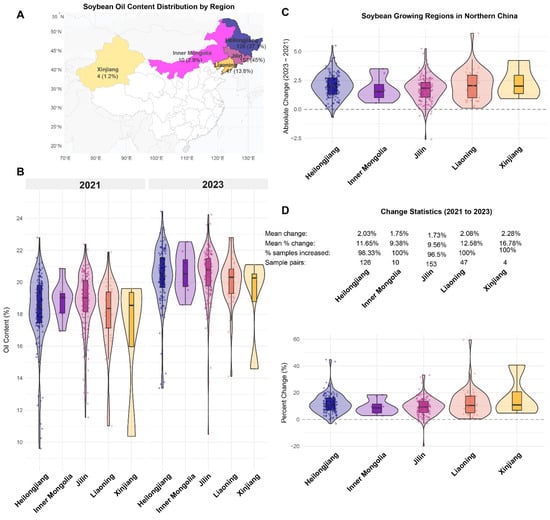 3.2. Soybean Oil Content Across Northern China’s Growing Regions (2021–2023)
