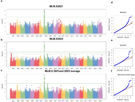 Manhattan plots and Q–Q plots from genome-wide association analysis of soybean oil content. Left panels (a–c) show Manhattan plots where the X-axis represents SNP positions across 20 chromosomes (GM01-GM20) and the Y-axis indicates −log10(p) values. The significance threshold (dashed line) was set at -log10(p) > 6.20. Right panels (d–f) display corresponding Q–Q plots showing observed versus expected -log10(p) values. Data are presented for 2021 (a,d), 2023 (b,e), and the two-year average (c,f).