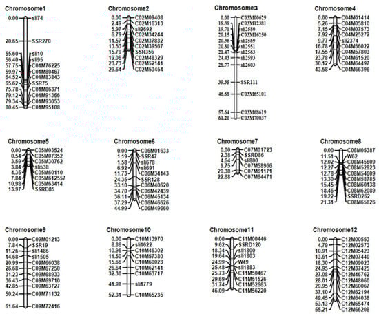 The number of markers and total genetic distances varied across different chromosomes (Table 1). Chromosomes 1, 3, 6, 9, and 12 harbored more markers, whereas chromosomes 5 and 7 had fewer. Chromosomes 1, 3, and 9 exhibited longer genetic distances, while chromosomes 2, 5, 7, and 8 had shorter spans. Specifically, chromosome 1 contained the highest number of markers (12) with the longest genetic length (80.45 cM). In contrast, chromosome 7 had the fewest markers (6), and chromosome 5 showed the shortest total genetic length (13.97 cM) (Table 1).