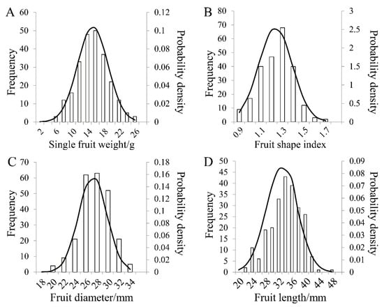Kurtosis values that indicated the peak of data distributions were all less than two in absolute value, with a maximum of 0.88. This suggested that trait distributions were relatively smooth and conformed to normality. Skewness values, which reflected distribution symmetry, ranged from −0.5 to 0.5 for all four traits, indicating approximately symmetrical distributions with minimal skewness. In addition, the fruit weight and fruit shape index detected by Shapiro–Wilk conformed to the normal distribution, and the fruit length and fruit transverse diameter conformed to the skewed normal distribution. These results confirm that the phenotypic data for all traits followed a normal distribution, consistent with the characteristics of quantitative traits and thus suitable for QTL mapping (Figure 2).