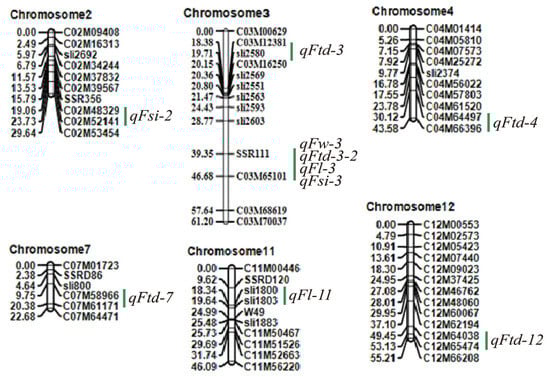 A total of 10 QTLs distributed across chromosomes 2, 3, 4, 7, 11, and 12 associated with four fruit-related traits were identified in the BC3F4 population, comprising 310 lines (Figure 3). These included one QTL for single fruit weight, two QTLs for fruit length, five QTLs for fruit diameter, and two QTLs for fruit shape index (Figure 3).