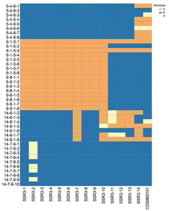 Polymerase chain reaction (PCR) amplification was conducted under the following thermal cycling conditions: initial denaturation at 95 °C for 5 min; 35 cycles of denaturation at 95 °C for 30 s, annealing at 55 °C for 30 s, and extension at 72 °C for 45 s; and a final extension at 72 °C for 10 min. The 10 µL PCR reaction system contained 0.4 µL forward and reverse primer (10μM), 5 µL Taq Master Mix (0.05 units/µL bioGold taq plus DNA polymerase, 4 mM MgCl2, and 0.4 mM dNTPs) (Nanjing SinoMol Biotechnology Co. Ltd., Nanjing, China), 1 µL genomic DNA template, and 3.2 µL ddH2O. PCR products were separated using 8% polyacrylamide gel electrophoresis (PAGE) (Shanghai Macklin Biochemical Co., Ltd., Shanghai, China). The PAGE solution was prepared using the following components: 49 mL H2O, 7 mL 10× TBE, 14 mL 40% PAGE, 70 µL tetramethylethylenediamine (TEMED) (Shanghai Macklin Biochemical Co., Ltd., Shanghai, China), and 500 µL 10% ammonium persulfate (APS) (Shanghai Macklin Biochemical Co., Ltd., Shanghai, China). After thorough mixing, the gel was poured into the casting tray and the comb inserted. Once solidified, the gel was placed into the electrophoresis chamber filled with 1× TBE buffer. Afterwards, 2.5 µL PCR product was loaded into each well, and electrophoresis was performed at 200 V for 70 min. According to the results of polyacrylamide gel electrophoresis, when the size of the bands was the same as recipient “Jina” and donor “LA2093”, it was recorded as “a” and “b”, respectively, with the heterozygote being recorded as “h”.