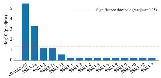 Correlation analysis of tomato single fruit weight with 14 molecular markers. The horizontal coordinate is the molecular marker, and the vertical coordinate is −log10(p-adjust) in the figure. The threshold is p-adjust = 0.05, which corresponds to −log10(p-adjust) = 1.3 in the figure.