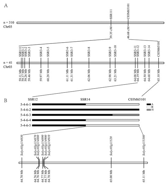 Fine Mapping of the qFw-3 diagrammatic map. (A) The preliminary location of qFw-3 was SSR111-C03M65101. (B) 5-4-6-1, 5-4-6-2, 5-4-6-3, 5-4-6-4, and 5-4-6-5 recombinant plants of 41 subpopulation plants. The physical location diagram of 8 candidate genes. According to the results of polyacrylamide gel electrophoresis, when the size of the bands was the same as recipient “Jina” and donor “LA2093”, it was recorded as “A” and “B”, respectively, with the heterozygote being recorded as “H”.