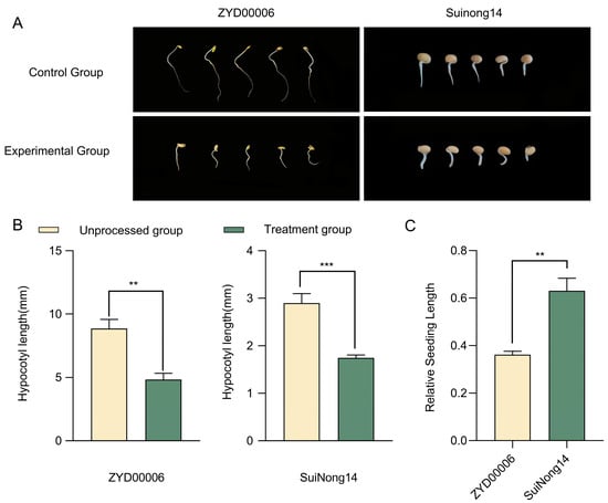 Phenotypic analysis of Suinong 14 and ZYD00006 under waterlogging stress. (A) Phenotypic comparison between Suinong 14 and ZYD00006 under control and waterlogged conditions. (B) Hypocotyl length measurements. (C) Relative seedling length (RSL) comparison. Data represent mean ± SE (Standard Error) (n = 3 biological replicates); ** p < 0.01, *** p < 0.001 (Student’s t-test).