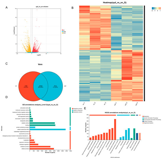 Transcriptomic comparison of Suinong 14 and ZYD00006 under waterlogging stress. (A) Volcano plot of differentially expressed genes (DEGs) with screening criteria |log2FC| ≥ 1 and padjust < 0.05. (B) Heatmap of identified DEGs. (C) Venn diagram showing differentially expressed genes between Suinong 14 and ZYD00006 under waterlogging stress. (D) GO functional annotation of DEGs. (E) KEGG pathway enrichment analysis of DEGs.