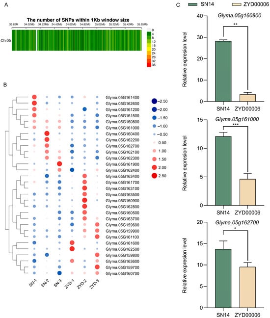 (A) SNP analysis of the 33.82–35.65 Mb interval on chromosome 5 in both Suinong 14 and ZYD00006 using a 1 kb sliding window. Variant counts (SNPs and InDels) are color-coded as follows: green (low variants), red (high variants), and white (no variants detected). (B) A heatmap of candidate genes containing SNPs or InDels in promoter regions or coding sequences. (C) Relative expression levels of differentially expressed genes Glyma.05G160800, Glyma.05G161000, and Glyma.05G162700 between Suinong 14 and ZYD00006, calculated using the 2−ΔΔCt method and normalized to GmUNK1 (Gm12g020500). Data show mean ± SE (n = 3); * p < 0.1, ** p < 0.01, *** p < 0.001 ns: non-significant, Student’s t-test.