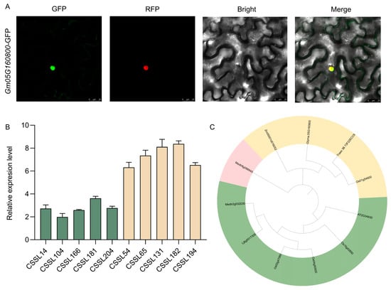 Localization of Glyma.05G160800 and its expression in different CSSLs. (A) Subcellular localization of Glyma.05G160800. BF: bright field; scale bar: 25 μm. (B) Phylogenetic analysis of Glyma.05G160800 in soybean, wheat, rice, maize, Lotus japonicus, Arabidopsis thaliana, and alfalfa, generated using MEGA 11 through the https://phytozome-next.jgi.doe.gov/info/Gmax_Wm82_a2_v1, accessed on 25 July 2024. (C) Expression analysis of Glyma.05G160800 in 10 CSSLs after waterlogging treatment. CSSL-54, CSSL-65, CSSL-131, CSSL-182, and CSSL-194 show strong waterlogging tolerance, while CSSL-14, CSSL-104, CSSL-168, CSSL-181, and CSSL-204 show poor tolerance. Data represent mean ± SE (n = 3).