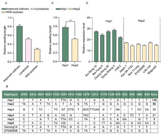 Haplotype analysis of Glyma.05G160800. (A) Seed waterlogging tolerance analysis in improved varieties, landraces, and wild varieties. Different letters indicate significant differences (p < 0.05; Student’s t-test). (B) Seed vigor phenotype analysis on 310 soybean varieties (229 improved varieties, 71 landraces, and 10 wild varieties) combined with haplotype analysis of Glyma.05G160800. Different letters indicate significant differences (p < 0.05; Student’s t-test). (C) Seed waterlogging tolerance comparison between Hap1 and Hap2. Data represent means ± SE of three replicate analyses. *** p < 0.001 (Student’s t-test). (D) The expression level of Glyma.05G160800 significantly differed among breeds carrying distinct haplotypes.