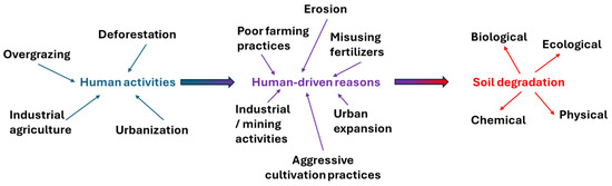 Soil quality is a term widely referenced in discussions on sustainable agriculture, capturing the overall condition of the soil. It includes various factors that contribute to the soil’s ability to support plant life, regulate water, sustain biodiversity, and act as a buffer against environmental changes. However, there is growing evidence that many agricultural soils are suffering from significant degradation. This degradation is manifesting in various ways, including erosion, loss of organic matter, contamination, compaction, and increased salinity. These issues collectively pose substantial risks to our agricultural systems, highlighting the urgent need for improved soil management practices to ensure soil health and sustainability for future generations [1]. The soil degradation problems can be classified into four categories: biological, chemical, ecological, and physical (Figure 1). Soil degradation manifests in multiple forms: biological, chemical, ecological, and physical—each contributing to the decline in land productivity. Biological degradation is marked by a reduction in microbial activity, often triggered by harmful biochemical reactions in exposed or unprotected soils. This leads to diminished soil fertility and reduced crop yields. Chemical degradation results from excessive use of synthetic fertilizers and pesticides, causing nutrient imbalances, loss of humus, shifts in pH, and a decline in beneficial microbial populations. Ecological degradation, largely driven by climate change, includes altered rainfall patterns, temperature increases, and extreme weather events, all of which reduce land productivity. Deforestation and vegetation loss further accelerate this process by increasing erosion risk and disrupting local ecosystems. Lastly, physical degradation involves the loss of topsoil through floods, runoff, landslides, wind erosion, over-tillage, and the use of heavy machinery. This form of degradation severely impairs soil structure, composition, and long-term fertility [2].