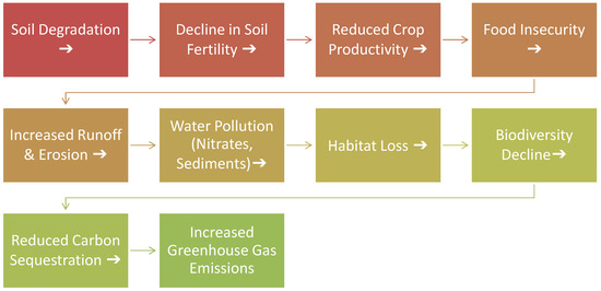Figure 2 shows the schematic illustration of the interconnected environmental impacts of soil degradation, highlighting the cascading effects on soil fertility, water quality, biodiversity, and food security.