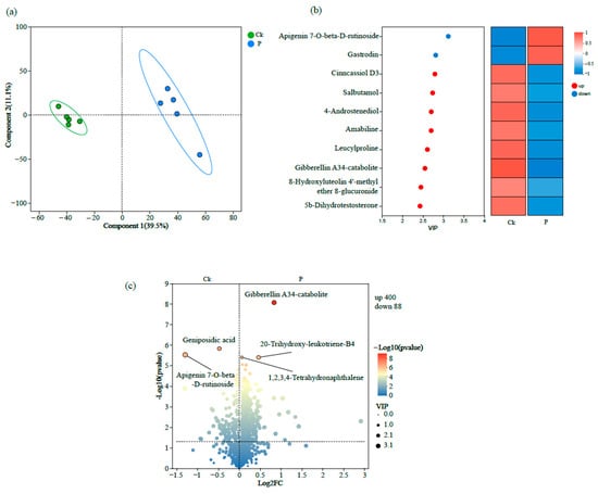 PLS-DA analysis revealed distinct clustering patterns between the two experimental groups, with Ck samples occupying the left quadrant and P forming a separate cluster in the right region of the score plot (Figure 1a). VIP score ranking identified apigenin 7-O-β-D-rutinoside and gastrodin as the most discriminatory metabolites enriched in P (VIP > 1.5), whereas Cinncassiol D3, salbutamol, 4-Androstenediol, and Amabiline showed significant accumulation in Ck (VIP > 1.5) (Figure 1b). To delineate the differentially accumulated metabolites, a supervised volcano plot analysis was conducted by integrating rigorous thresholds of fold change (FC ≥ 1.5 or ≤0.67) and VIP. Comparative analysis identified 400 metabolites significantly up-regulated in Ck (vs. 88 in the P group, p < 0.05). Intriguingly, gibberellin A34-catabolite, 20-trihydroxy-leukotriene-B4, and 1,2,3,4-tetrahydronaphthalene exhibited pronounced enrichment in Ck. Significantly, when applying more stringent criteria (p < 0.01, VIP > 2.0), apigenin 7-O-β-D-rutinoside and geniposidic acid were exclusively over-accumulated in the P group (Figure 1c).