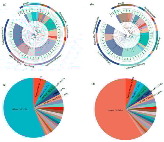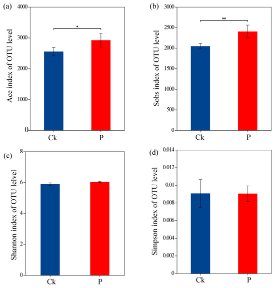 Alpha-diversity analysis revealed significant differences in community richness between groups, with the ACE index and Sobs values of Ck being substantially lower than those of the P group (p < 0.05) (Figure 2a,b). However, no significant differences were detected in Shannon and Simpson diversity indices between the two groups (Figure 2c,d). Taxonomic profiling at the class level demonstrated that Alphaproteobacteria (24.6% in Ck vs. 26.1% in P) and Gammaproteobacteria (16.7% vs. 16.1%) constituted the predominant bacterial classes, followed by Actinobacteria (10.8% vs. 8.5%) and Bacilli (6.1% vs. 8.0%) (Figure 3a,b). At the genus level, Sphingomonas (7.15% vs. 6.26%) and Bacillus (3.47% vs. 4.07%) emerged as the dominant taxa, with secondary contributions from the Allorhizobium-Neorhizobium-Pararhizobium-Rhizobium (ANPR) complex and Arthrobacter (Figure 3c,d).